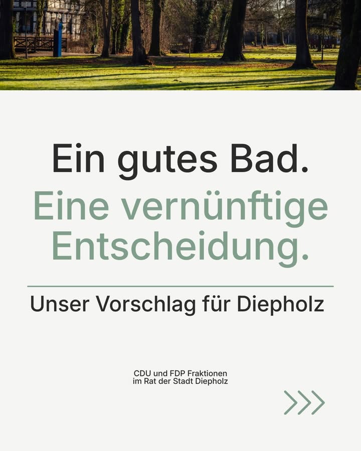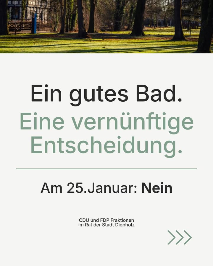 Am 25. Januar entscheiden die Bürgerinnen und Bürger in Diepholz über die Zukunft unseres Schwimmbads.Wir setzen uns für ein modernes Allwetterbad ein, das ganzjährig genutzt werden kann ? für Familien, Schulen, Vereine und den Sport.Ein Bad, das Lernen, Bewegung und Freizeit verbindet.Realistisch geplant, professionell konzipiert und langfristig tragfähig für unsere Stadt.Deshalb sagen wir:Für ein gutes Schwimmbad braucht es eine vernünftige Entscheidung.👉 Beim Bürgerentscheid am 25. Januar: NeinCDU und FDP Fraktionen im Rat der Stadt Diepholz